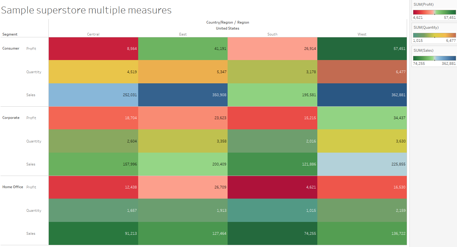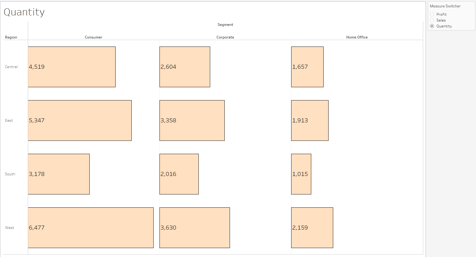 Obviously this isn’t tableau so the measure switcher doesn’t actually work, but clicking on the different measures will change the values in the table accordingly. More of a general comment, the colour format of the cells is less than helpful. I instead chose sized bars to show the same thing with a flat colour. Hopefully it should be clearer to see that within the west region, the consumer segment has the highest quantity (ignore that we have no idea what that actually means), compared to on the other table.