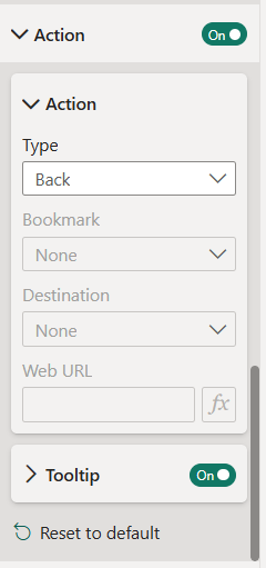 Further down in the pane you will find the Action section. This is where you set what the button will do, for example navigating to the previous page, next page, or returning to the beginning of the report etc.