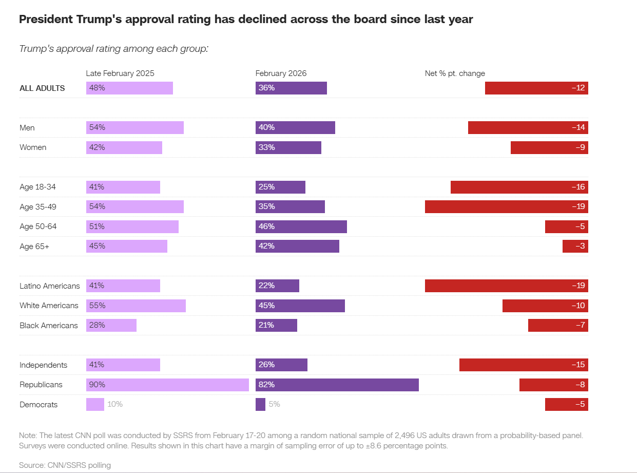Die folgende Visualisierung analysiert die Zustimmungswerte von Donald Trump im Vergleich zwischen Februar 2025 und Februar 2026. Obwohl der Chart auf den ersten Blick strukturiert wirkt und relevante Informationen enthält, zeigen sich bei genauerer Betrachtung mehrere gestalterische Schwächen, die die Lesbarkeit und Interpretation beeinträchtigen.