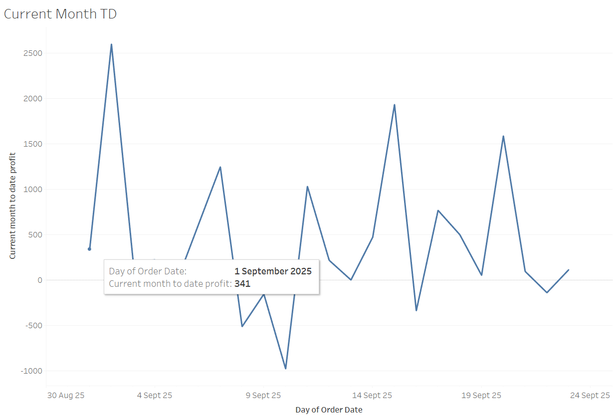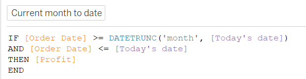 Shown above is a calculated field which calculates how much profit has been made between the start of the month to your current day.