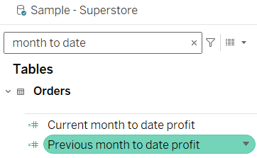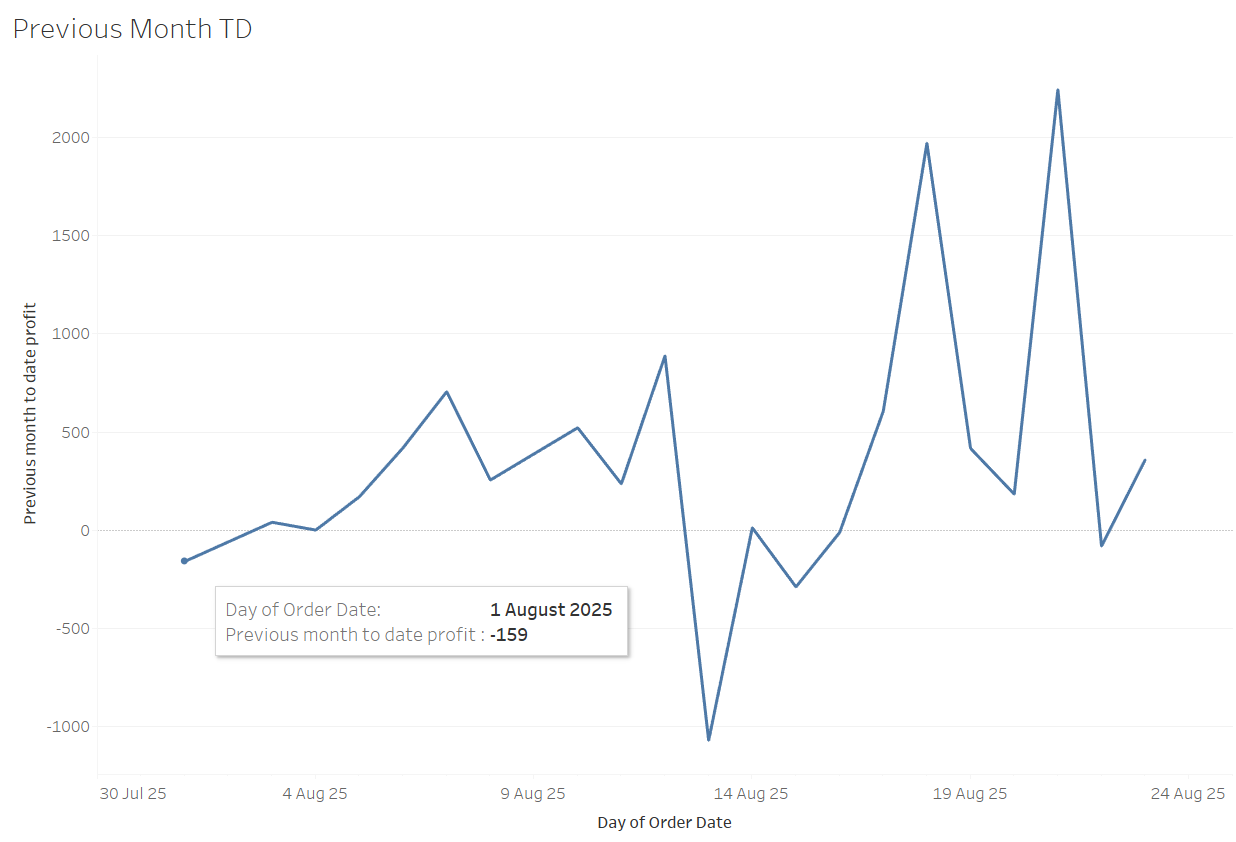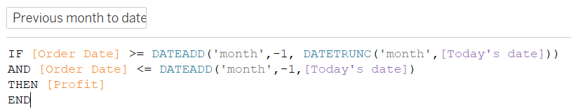 Shown above is a calculated field which calculates how much profit has been made between the start of the previous month to your current day in the previous month.
