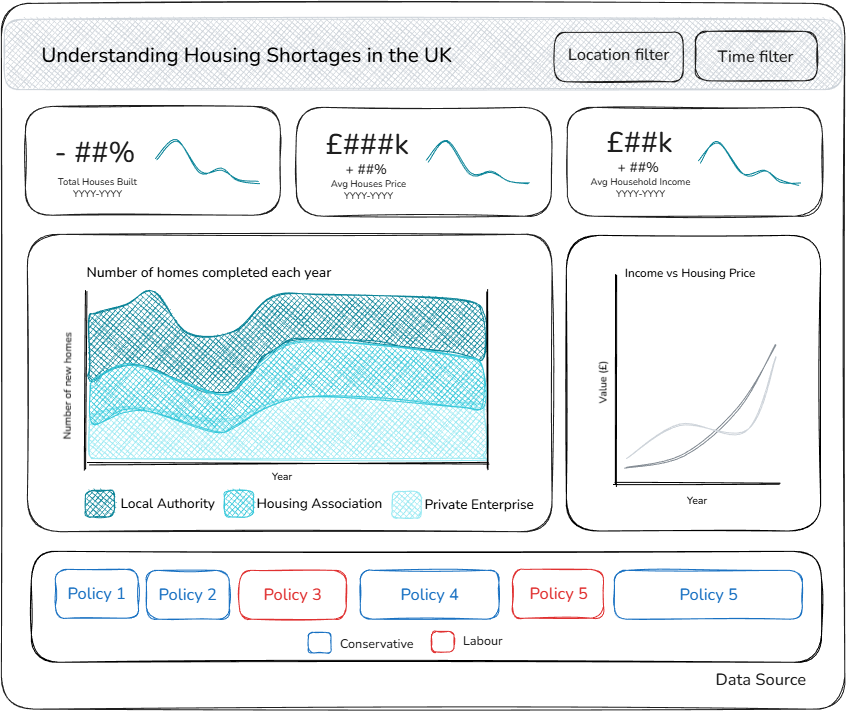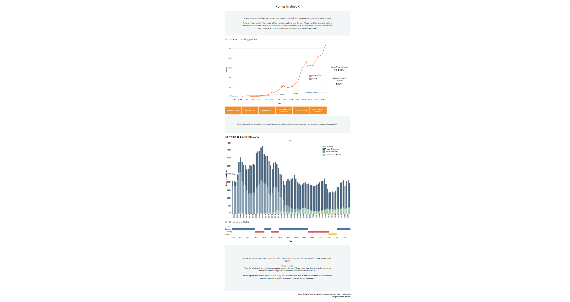 The dashboard in question looks at house building in the UK between 1949 and 2025. My initial attempt had many ideas for comparison with household income, increase in house prices, and government policy, but had no real direction for the dashboards story.