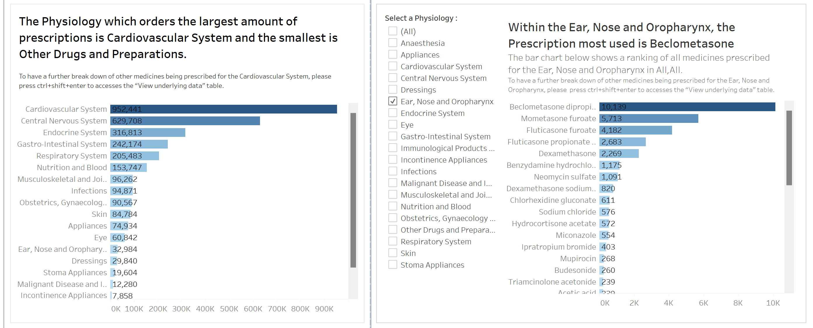- 2 charts for physiology, to be able to click to filter to see the drill down as(As two columns is harder to read in cross tab)