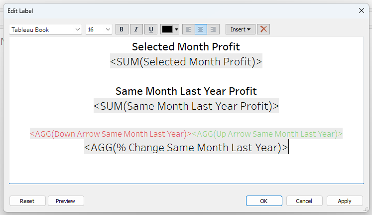 - Create a new sheet and drag the following fields onto Text: Selected Month Profit, Same Month Last Year Profit, % Change, Up Arrow Calc, and Down Arrow Calc. Edit the text to be formatted like so:
