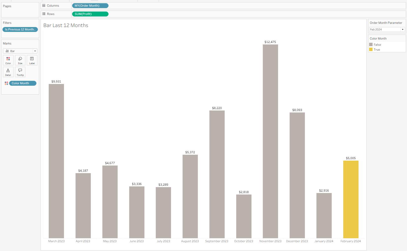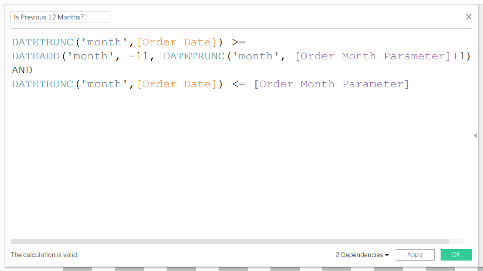 - Create a boolean calculation to show bars for 12 months prior to the month selected in the date parameter. Add this to the filter card and select True.