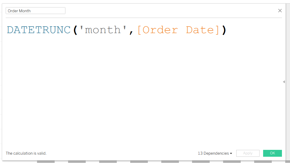 - Create a field for Order Month that you'll be able to reference moving forward, rather than needing to truncate in each individual calculation.