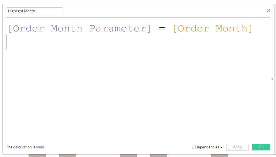 - Create a calculation to highlight the month selected in the date parameter. Add this to Color in the Marks Card.