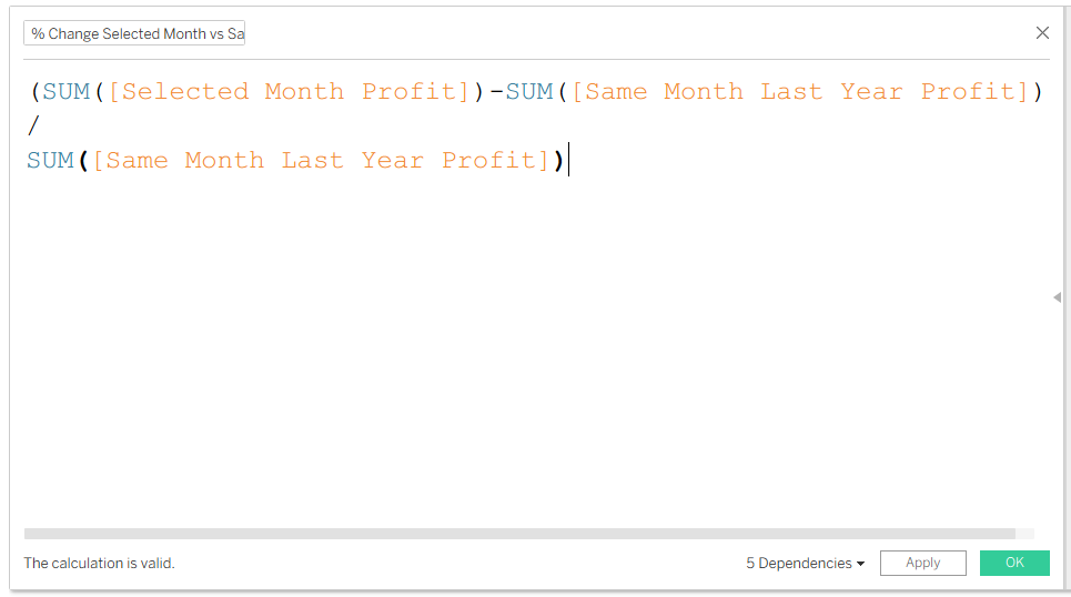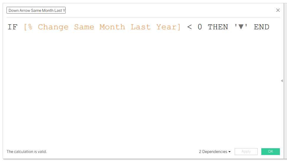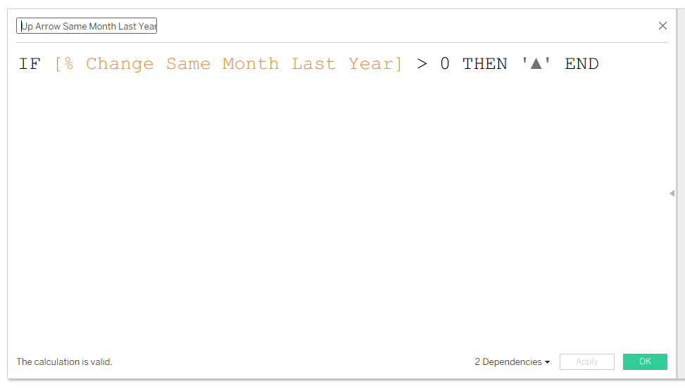 - Create a calculated field to generate an up arrow when the profit difference is greater than 0.