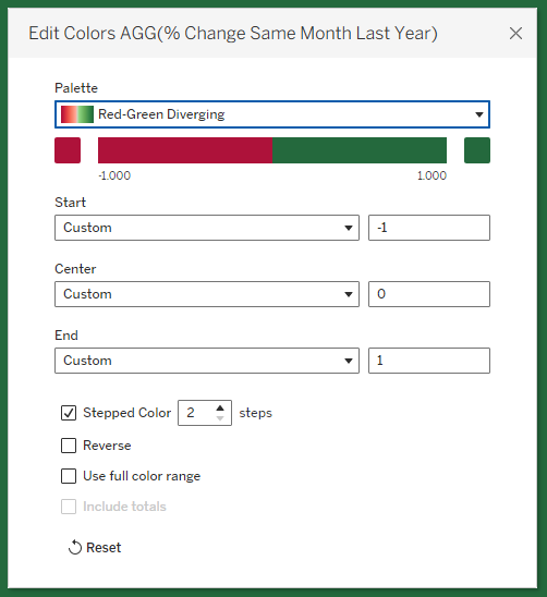 - To create the red/green line showing profit greater or less than 0, create a new sheet and drag your % difference calculation onto Color in the Marks Card. Change the view to Entire View. Edit the color settings like so: