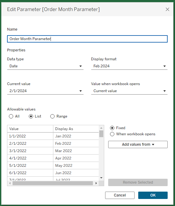 - Create a parameter for Order Month.