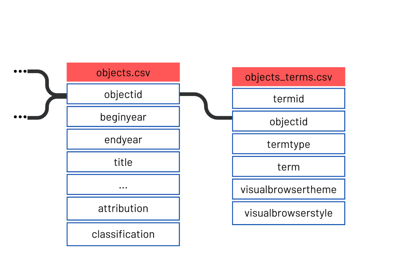 - Tableau: download the 17 comma separated values (csv) files and use the ‘Source Data’ section in Tableau to join the relevant datasets. You could start, for example, by performing a left join between the ‘objects’ and ‘objects_constituents’ tables and then a second left join with ‘constituents’ to find out more details about the authors of the artworks.