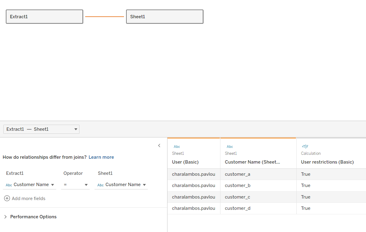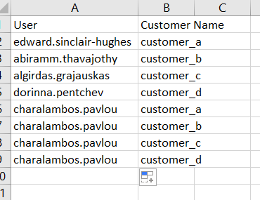 The First step would be to create a separate spreadsheet relating to the dimension field you want to limit access to for example here we already had a field called customer name in the data this is done so we can logically relate the two data sources. User is the tableau usernames of some people, the logic here is that charalambos has access to all 4 customers data whereas edward only has access to data for customer a.