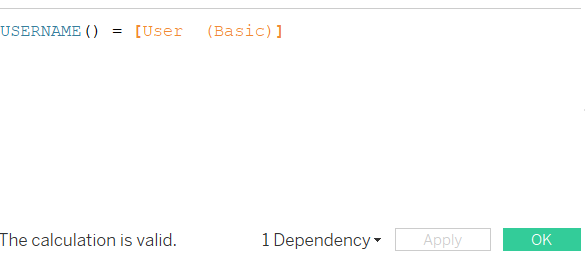 Then once this is done we need to create a calculation to check who is allowed to view what. This is shown in the calculation below. Its a simple boolian calculation. That checks usernames in tableau server (lower case with a full stop between your first name and surname).