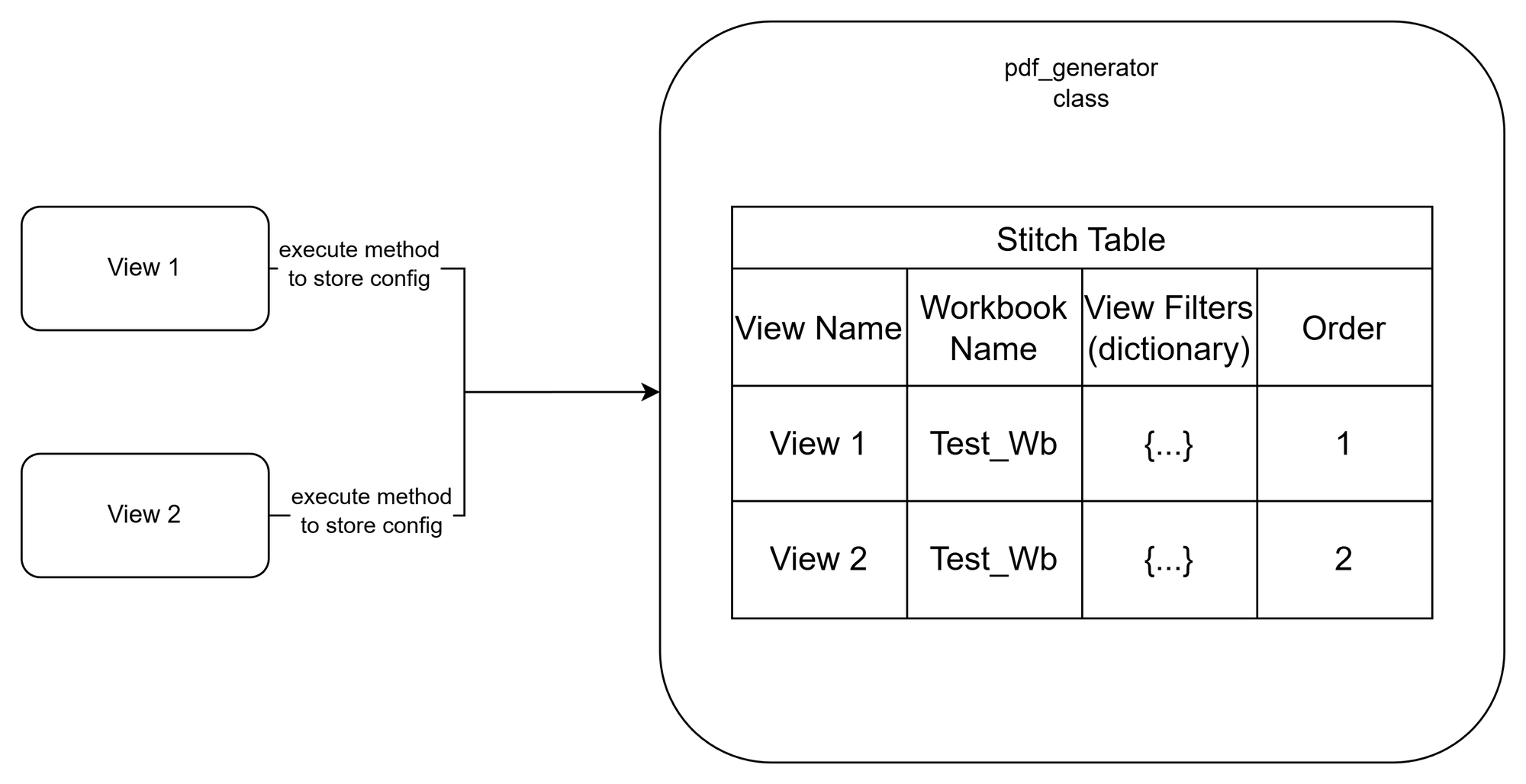 Below is the big-picture of how I set up my class, which I call "pdf_generator." Through an executable step within the class (hereafter called method), the class can "record" the configurations of each view separately. The recording happens behind the scenes in what I call the "stitch table." This table stores the configurations of each view until the PDF is ready to be generated.