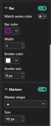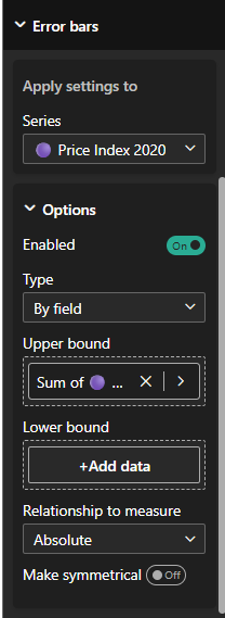 - To create the dots, navigate to the Visualisation Pane, then to the Analytics tab. Scroll down to the errors bars section. The following configurations need to be setup for the middle and most recent period fields, where the upper bound is set to the sum of the field itself, and marker type set to circle and maximum sizing. In order to get the line's connecting the dots, for the lowest value (2015 Index Field), set this as the lower bound and the upper bound as the highest value, with the bar colour set to grey.