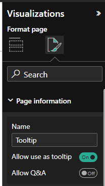 - After configuring the charts and KPI's as you wish, then go to the Format Page, Page Information and Allow use as tooltip should be toggled on.