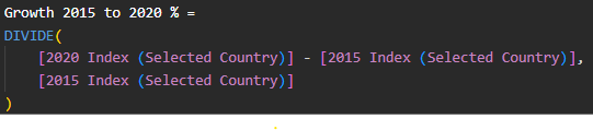 - For the growth between periods KPI, it requires a calculation for the value itself, as well as the measure for formatting. The value is found by dividing the difference between the 2 periods over the original year. For example, the growth from 2015 to 2020, take (2020-2015)/(2015).