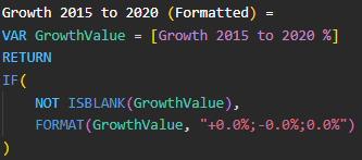 - Formatting the values, in this case to have the +/- sign and to a single decimal place is done by creating a new value for each of the change between period calculations.