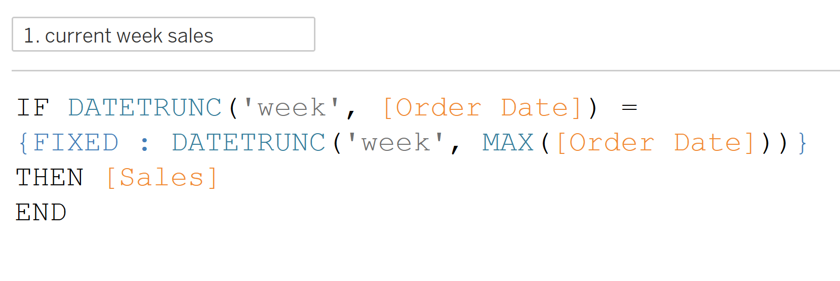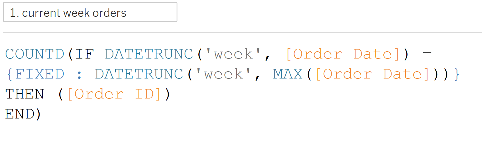 For this KPI, we wrap both calculations in a COUNTD function to count the distinct orders in each week.