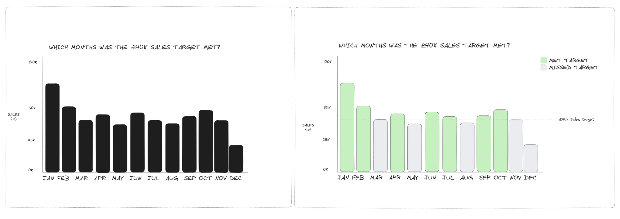 The chart on the left does a good enough job at displaying which months has higher or lower sales values but it’s not as clear which months hit the sales target.