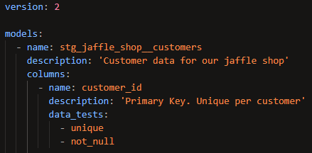 Here's an example of a unit test used in the official dbt documentation for them. This is the definition of a model called dim_customers:
