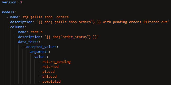 Here's another example in which an accepted_values test is applied to the status column in the stg_jaffle_shop__orders model: