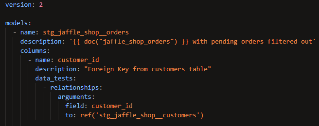 This test asserts that every value in the customer_id column in the stg_jaffle_shop__orders model also exists in the column customer_id in the stg_jaffle_shop__customers model. In other words, everyone who's placed an order is listed in the table of customers. This is the most common application of the relationships test – checking that a foreign key has analogous values in the table in which it's a primary key.