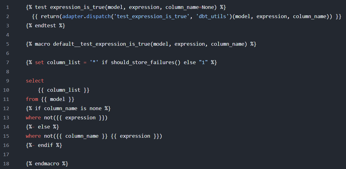 If you'd like to see the definition of the test, you can view the GitHub repo for the package (which you can find in the package hub page that I linked above). This is a more advanced test than the ones shown above. It allows you to write SQL as an argument. If that SQL statement evaluates to false, the test will fail. Here's the code used to create the test (which also involves defining a macro):