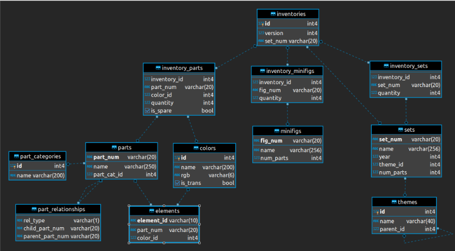 Luckily, there was a readily available schema on the Rebrickable website, which helped me identify the joining keys and better understand how the different tables related to one another.