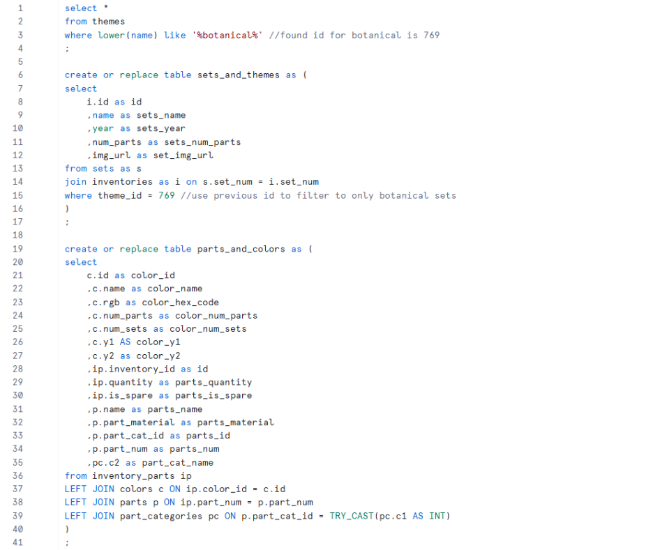 - Moving onto parts and colours, there wasn’t much thought behind the fields I kept — I mostly selected columns that appeared useful, which in hindsight meant I carried through more fields than needed and made dashboarding more difficult later on. Saying this, I did leave out the part_relationships and elements tables , as I didn’t feel they added much value. For the remaining tables, I used left joins from the inventory parts table as I wanted the granularity to represent a specific part, in a specific colour, within a specific set.