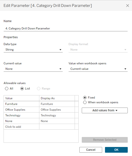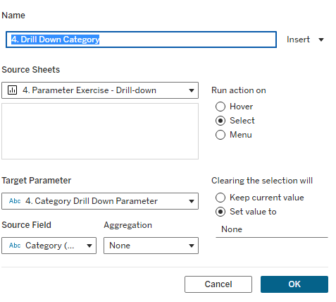 1. Finally we add a dashboard/worksheet action so that tableau can identify that the user has selected a category, enter the category selected into the category set and then that triggers the calculated field to rerun its logic. (make sure you select change set values)