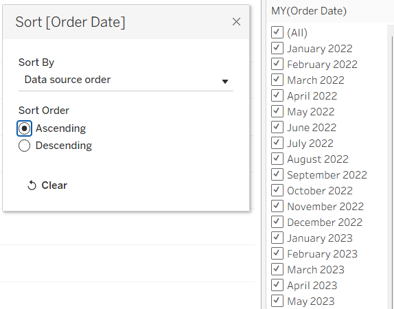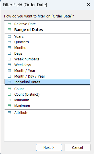 And that's it! If you want to filter by different parts of the date like you would usually have the option to do (i.e., MY (just the month, year like the first example) you should create a calculated field first that truncates the date first before following these steps.