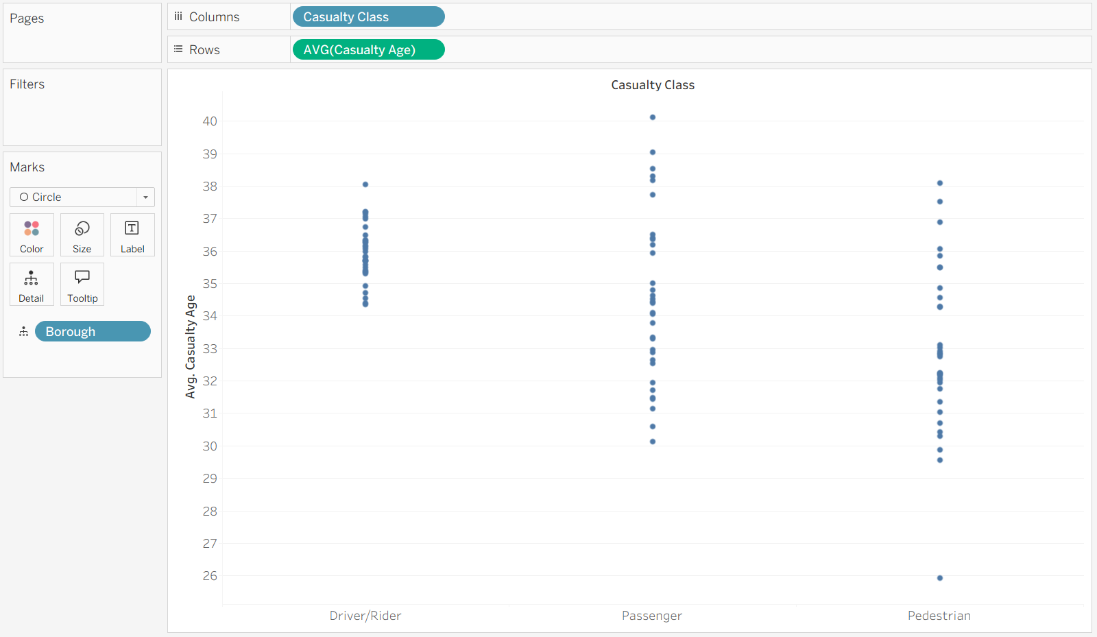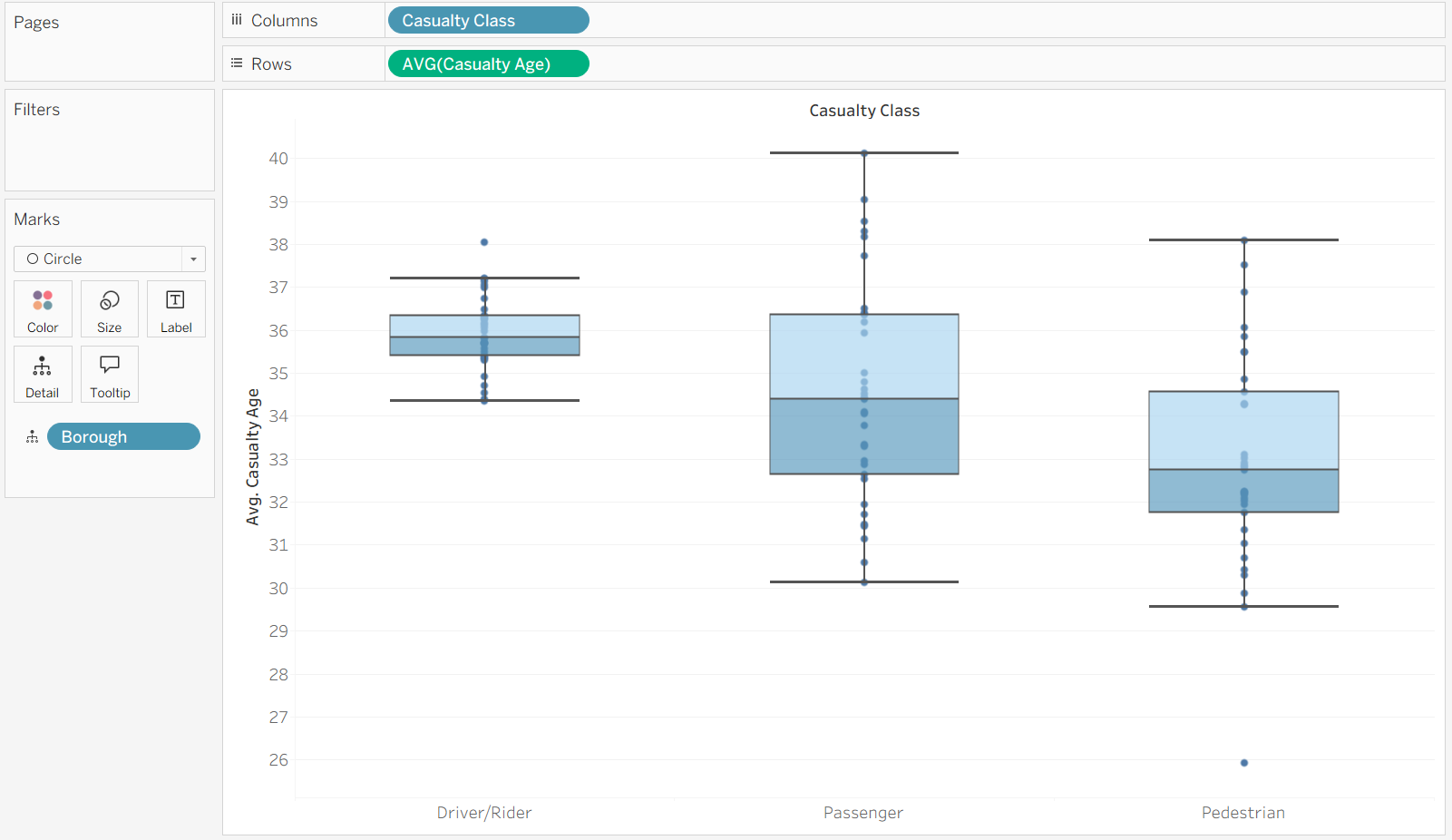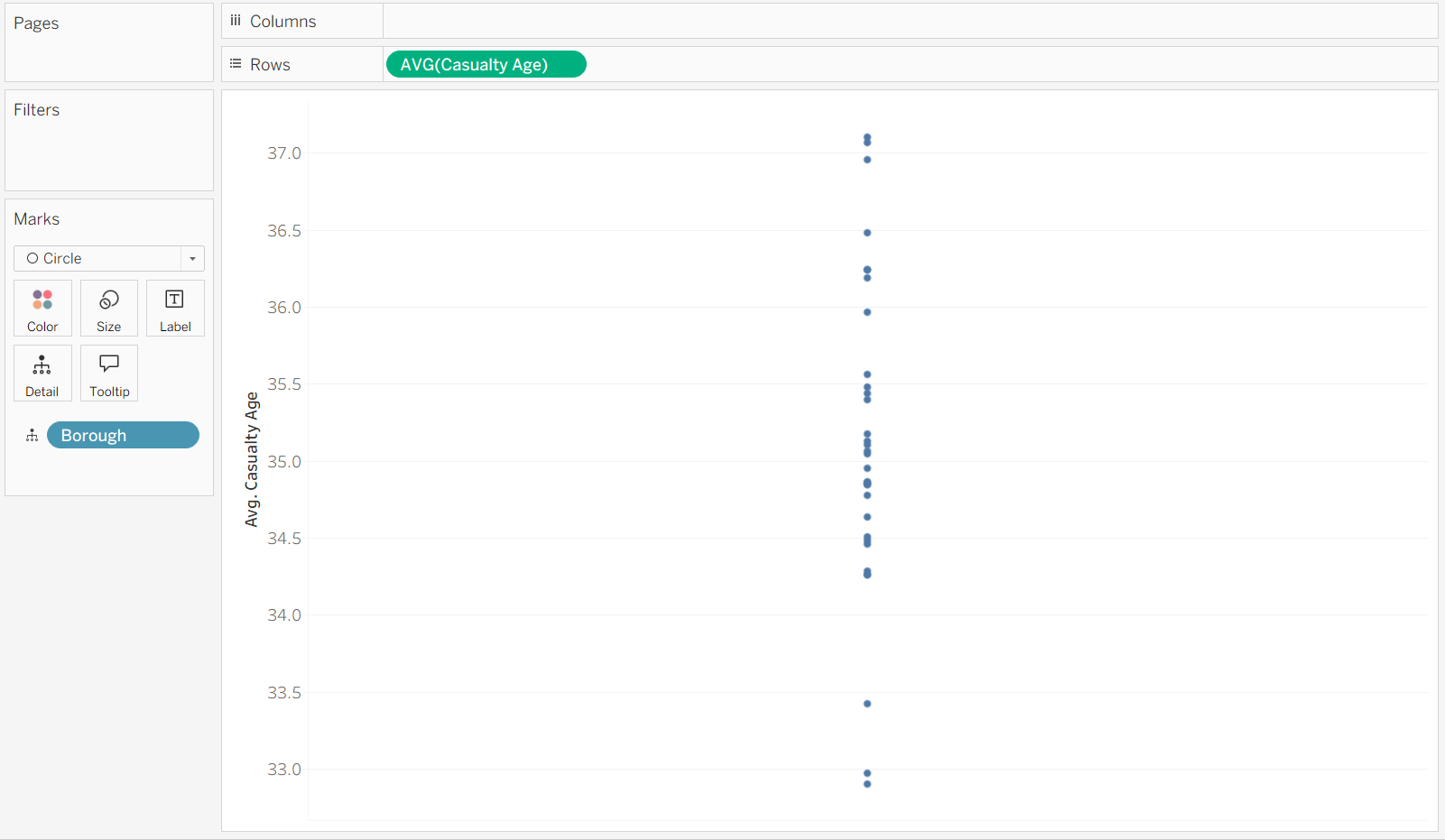 We want to see the average casualty age, and spread, of each borough. First, we need to drag the Casualty Age field to rows and average it. Then, drag the Borough field in to Detail.