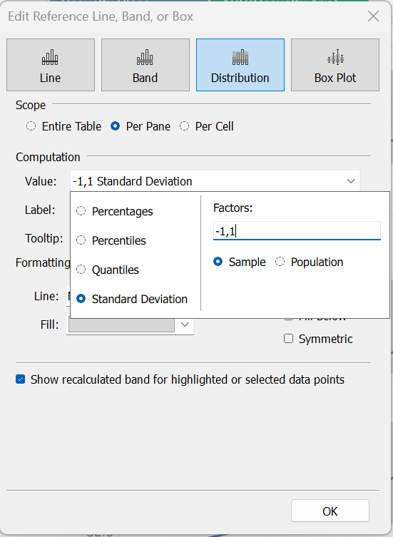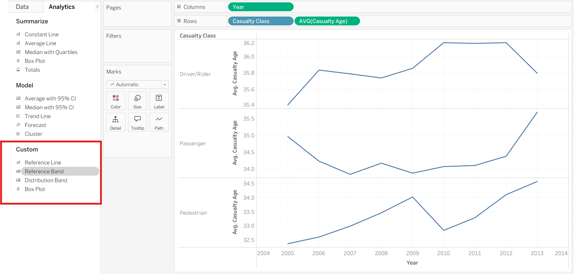 This time we will drag a Reference Band from the analytics pane onto the chart.