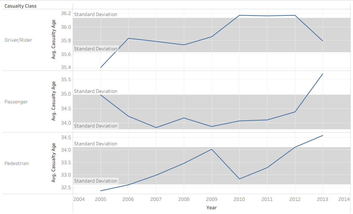 The shaded region represents the range of values that fall within one standard deviation of the mean, making it easy to identify years where casualty age deviated significantly from the average.