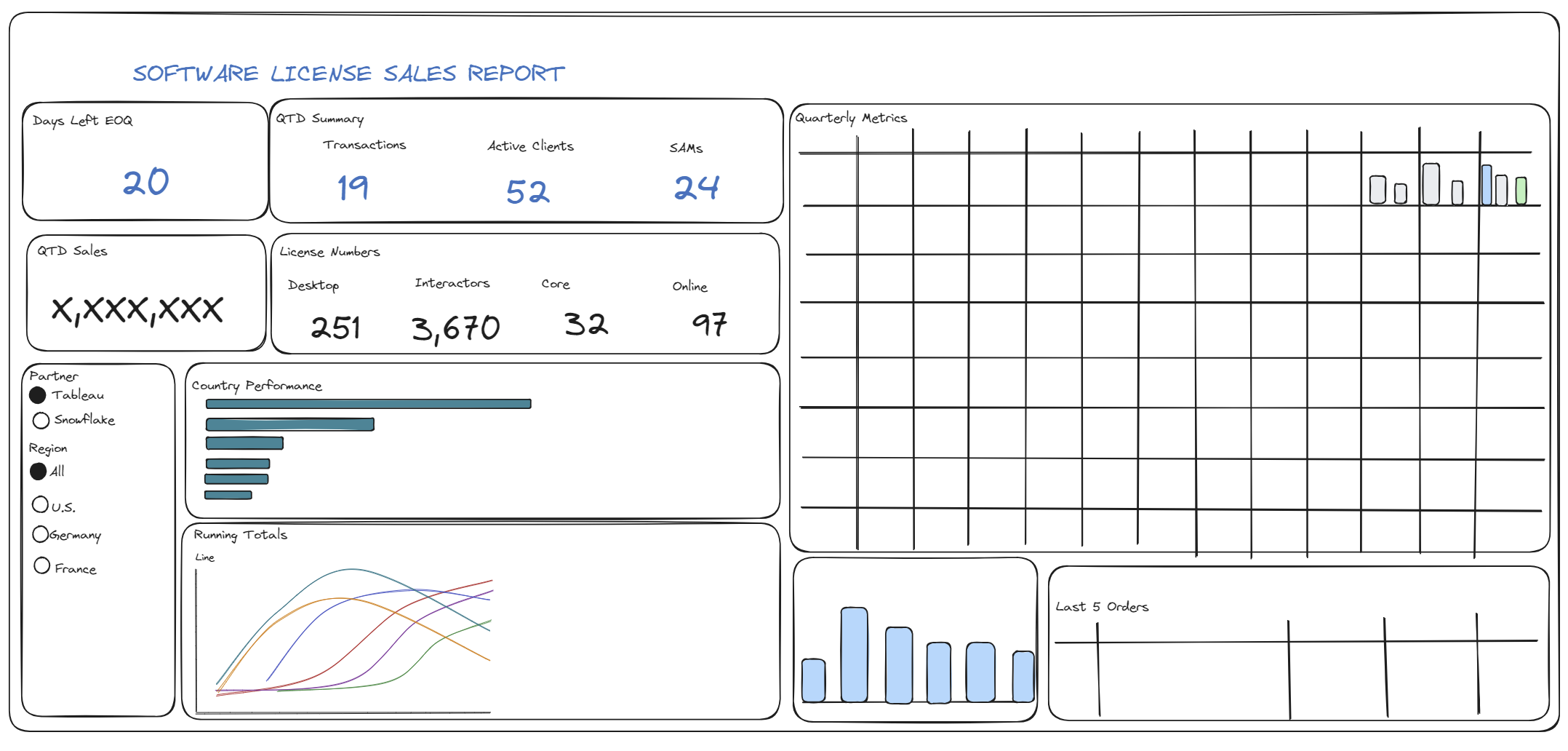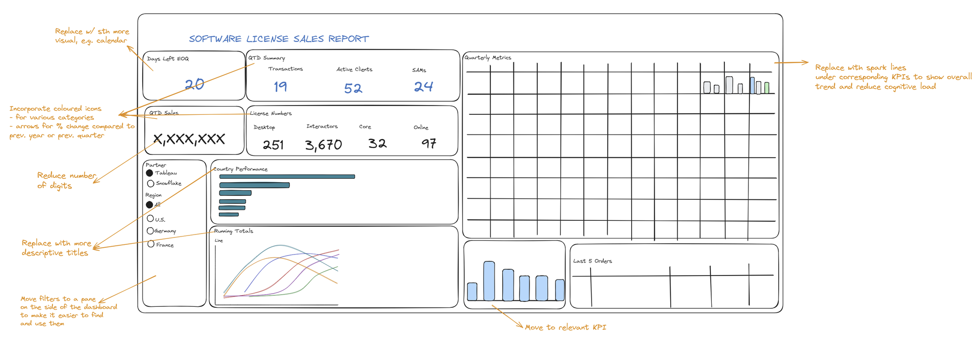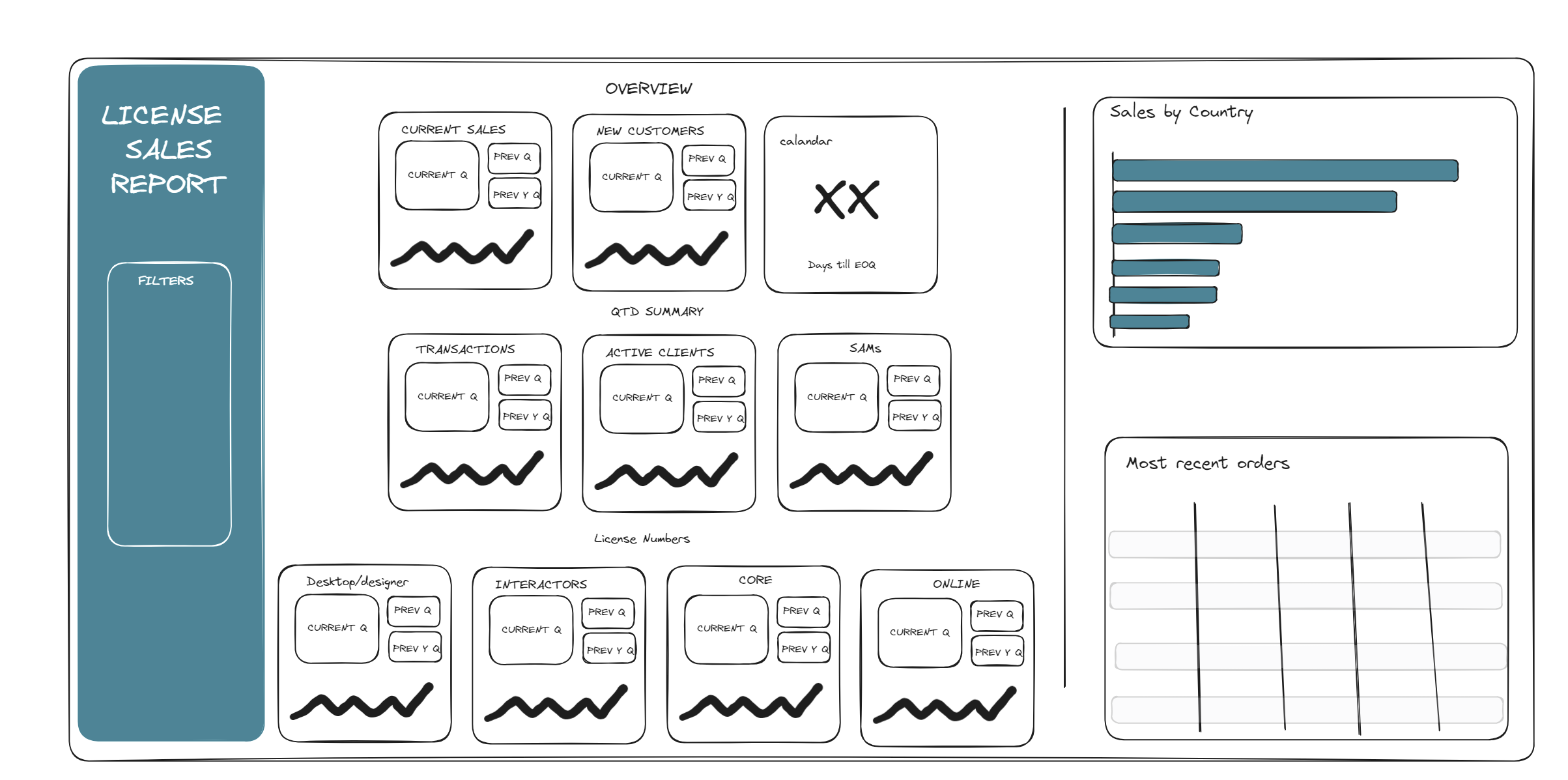 Harvey and I worked on redesigning a license sales dashboard (sketched below) to be used by both current and future staff, and be accessible to someone with dyscalculia.