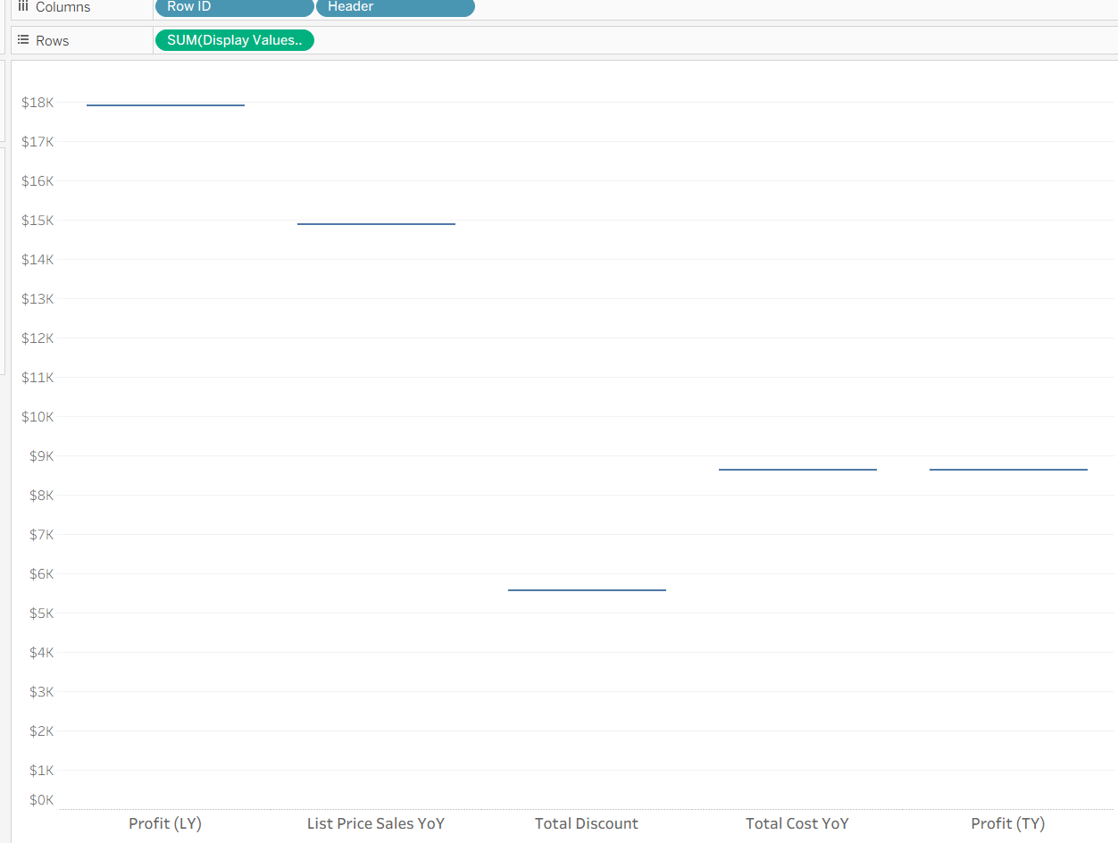 After creating those calculations you want to use [Row ID] on your columns to create 5 headers, we are only going to use rows 1-5 by filtering to show up until Row ID 5. The calculation for the header of each bar in the waterfall chart is: