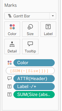 Then drag [Size] onto marks size and click onto the green pill so you can change it from [SUM([Size]])] to [SUM(-[Size]])]. This will change the direction of the length, instead of them being extended upwards from your Gantt Bar these will be extended downwards.
