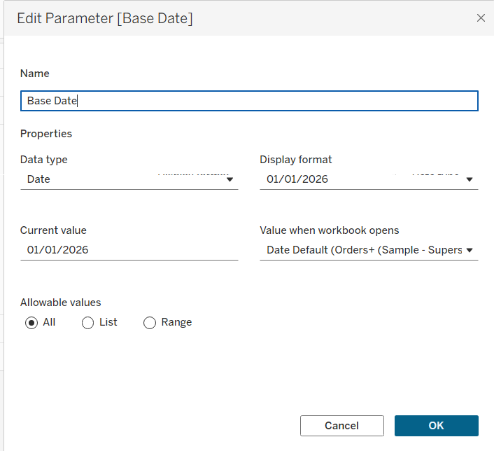 First, create a parameter to let the user choose a date that they would like to view the profit breakdown for. Name it Base Date - This will allow the user to choose any date they like.