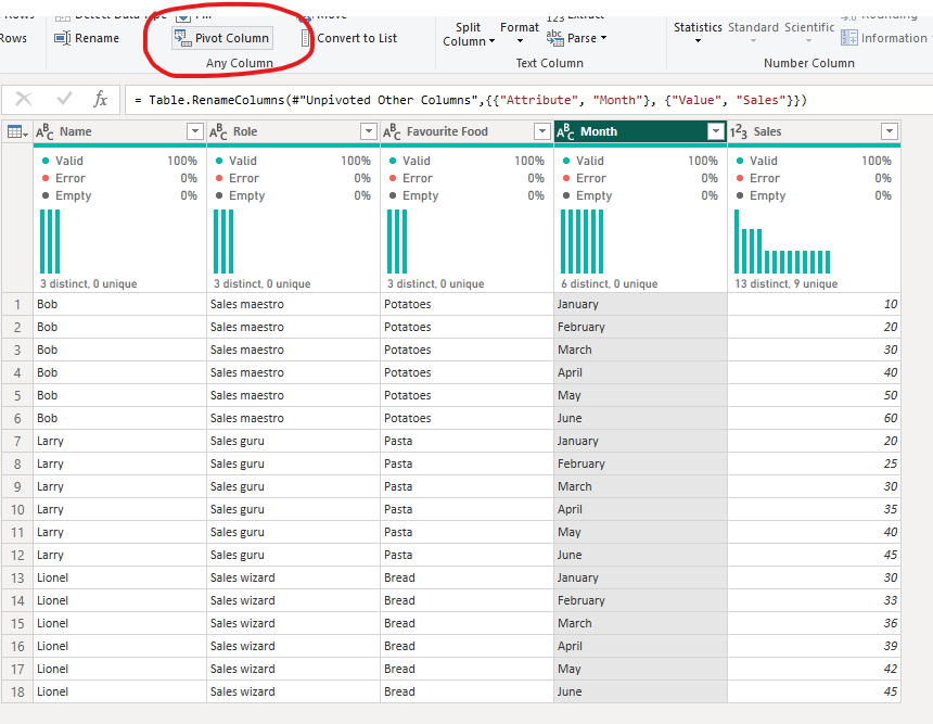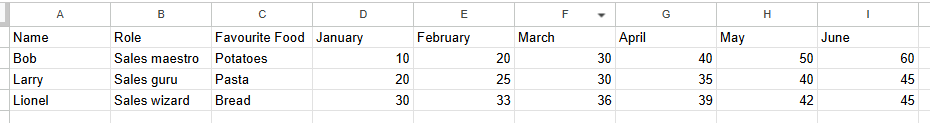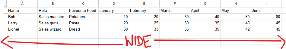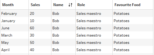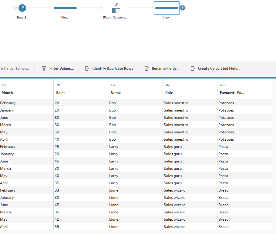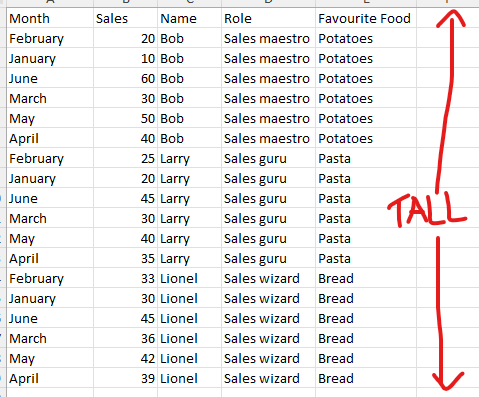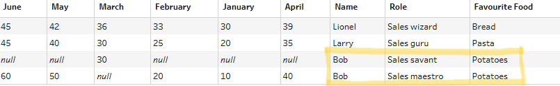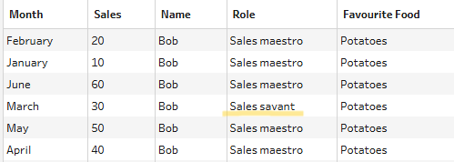 In the example below, name, role and favourite food columns are exactly the same across the different rows as you'll see (i.e. for each January to June grouping, there is a trio of name, role and favourite food columns which remain unchanged). The only thing that changes in those rows are the month and sales value. This repetitive nature is what allows for the rows to be flattened into one.