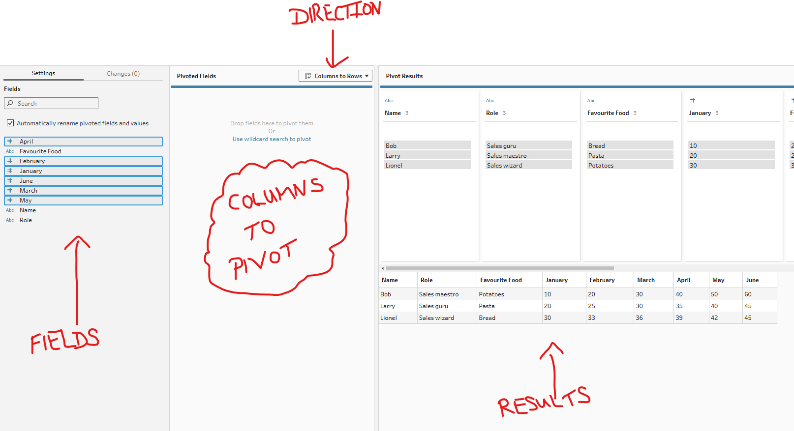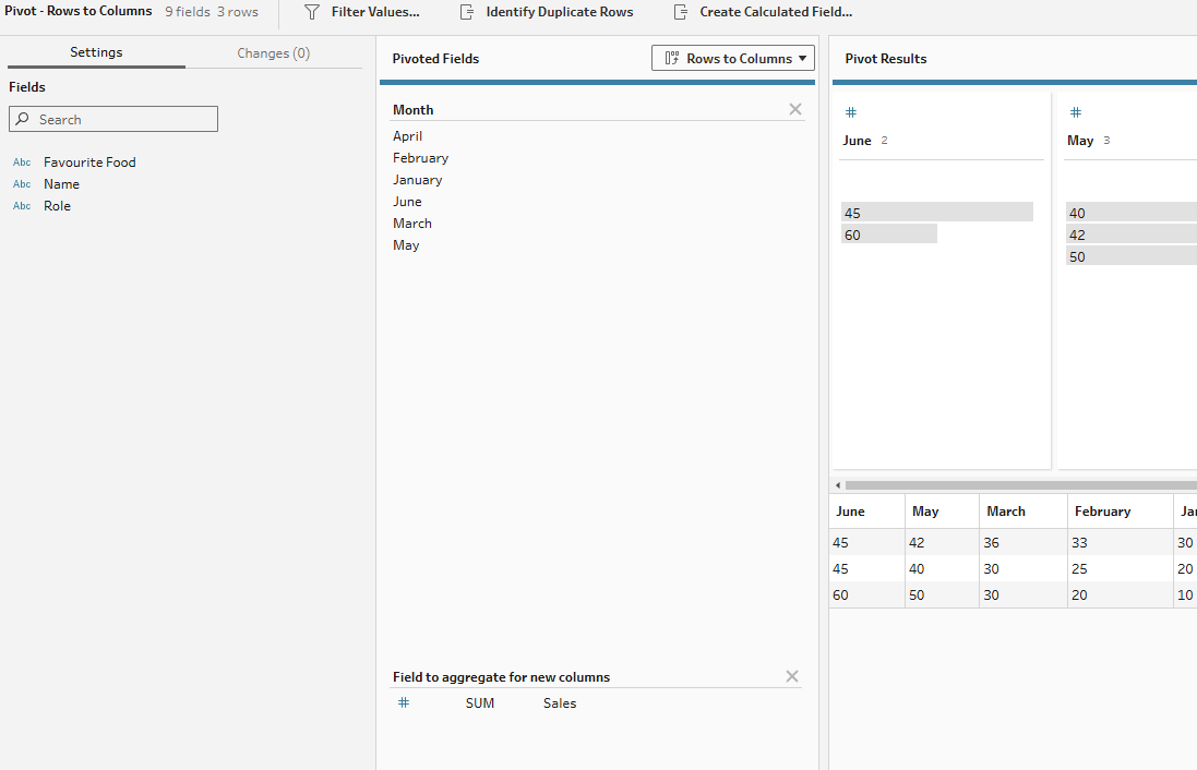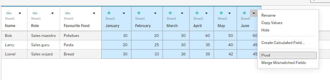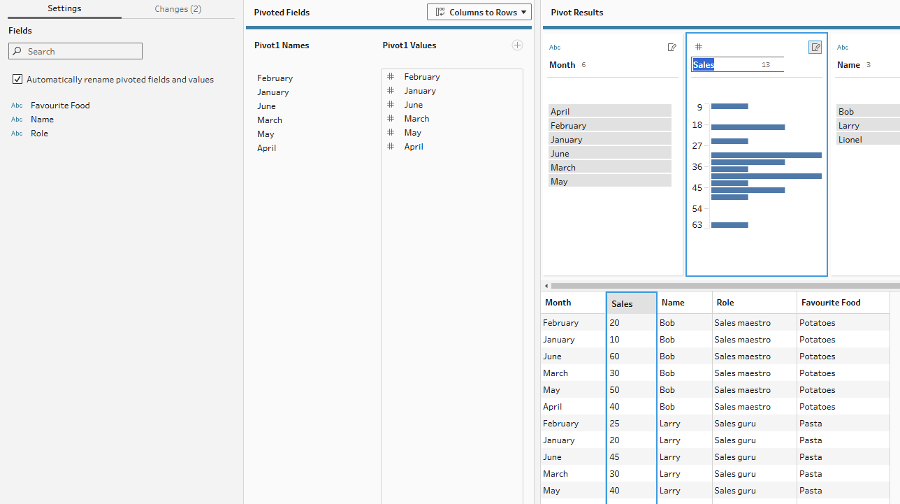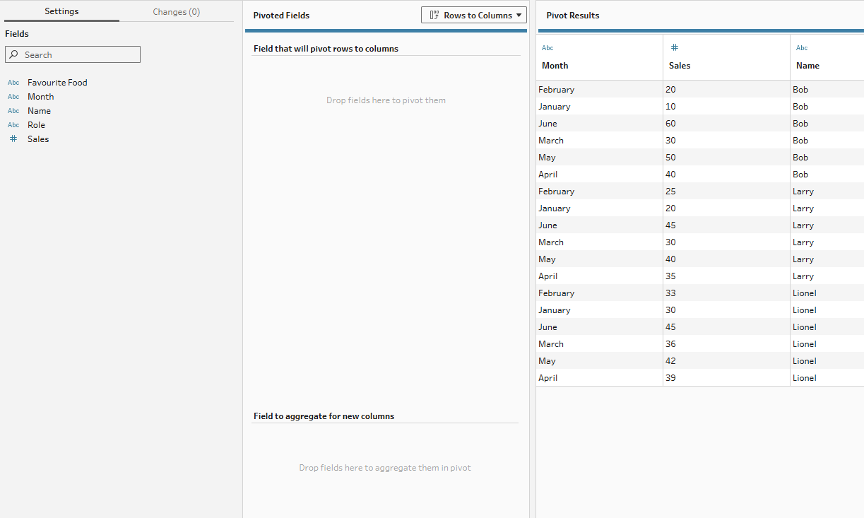 In these sections, you need to specify which rows will be made into column headers (typically your metric column) and which values will go into those columns (typically your value column). In our example here, our metric column is month because we want the rows that represent each month to become a column for each month instead. So that Tableau knows which values are associated with those new columns, we have to assign the monthly sales to the aggregate section. Our aggregation is not necessary in this case as we have a 1-to-1 match but if we had multiple values for each new column (e.g. if there were multiple Bob-January values), then the aggregation type would be important to specify. In this case, just having sum is fine.