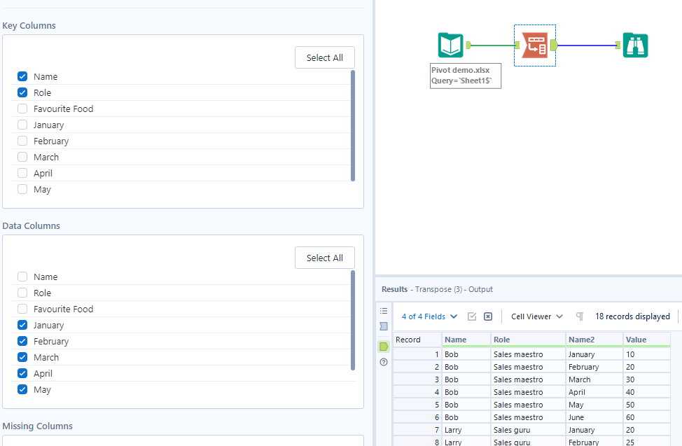The default configuration of the transpose tool is having all columns selected in the data columns section. When you select a key column, it will automatically deselect in the data section as the options do not make sense to be in both sections. Be mindful when selecting and deselecting options as, unlike in Tableau Prep, not all columns have to be carried through the transpose. This is a benefit when you don't want to know the favourite food of the employee for example, but also a drawback if you accidentally lose role by deselecting from the wrong place.