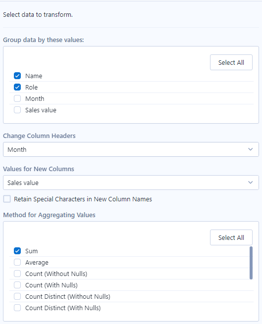 IMPORTANT TO NOTE: Whilst you can pivot from columns to rows with whichever columns that you choose, you need to be more careful with rows to columns. If you want to avoid nulls from cropping up in your newly shaped data, the only difference between the rows can be your pivoted and aggregated fields.