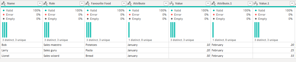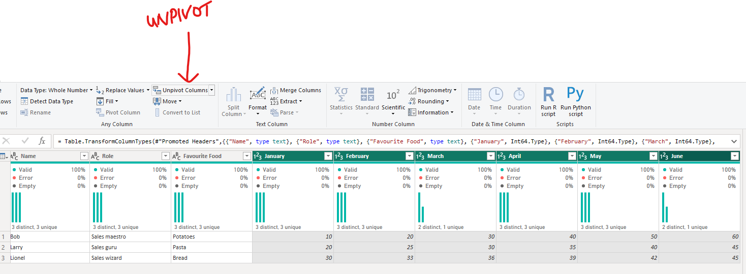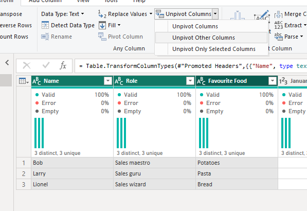As all of our columns to unpivot are next to each other, I simply clicked on the January header, held the shift down and then clicked the June header, which automatically selected all the columns between as well. Then I went to the transform tab and selected unpivot, as above. It's important that all the columns that you want to pivot are selected in one step, otherwise you'll end up with a mess like I created as an example below, by trying to complete the steps one by one.