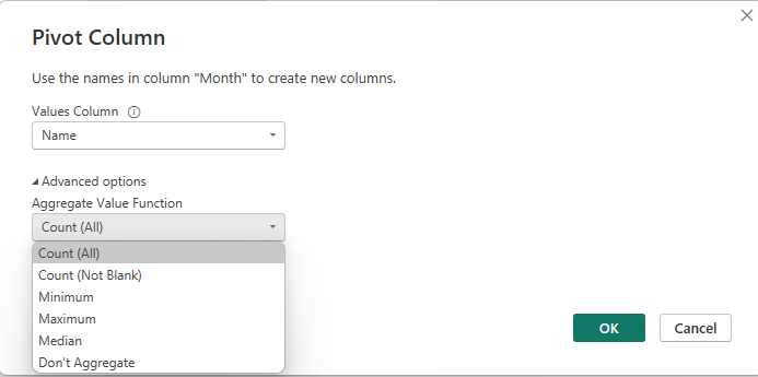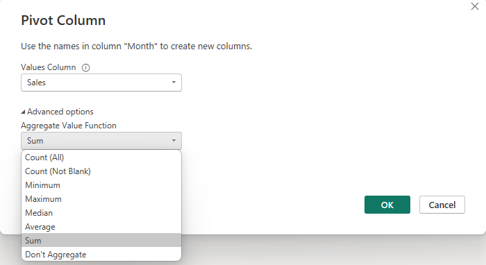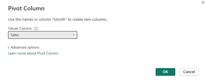 A pop-up window will appear where you have to specify which column you'd like to use as values in your new columns. The automatic aggregation is sum but if you'd like to specify a different aggregation, you can go to advanced options.