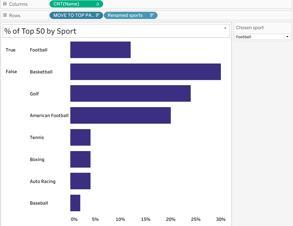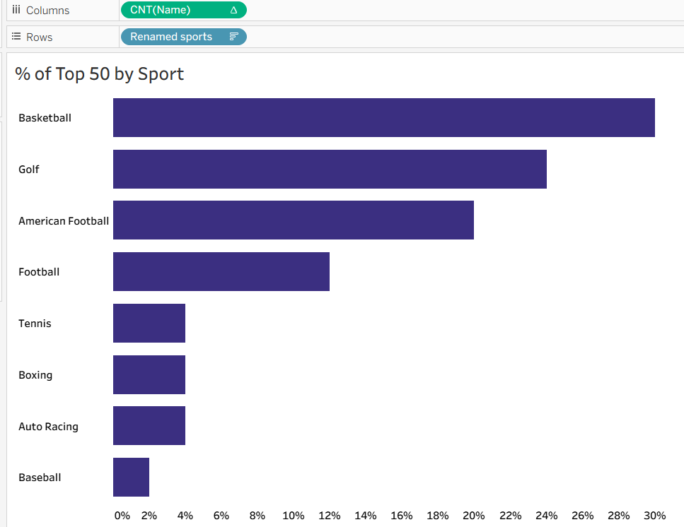 Step 1: Create the basic chart. For this simple bar chart, I dragged sports (or in my case, renamed sports because I just couldn't stand for calling football 'soccer'!) onto the rows shelf and count of name onto columns. I then did a quick table calculation from the drop down, opting for percent of total.