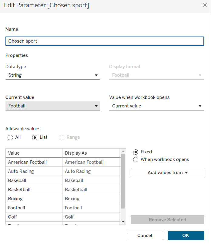 Step 2: Create your parameter. You want your chosen category (for me in this case, it was renamed sports) as your parameter. You can add these values quickly using the bottom right drop down (Add values from...). Your data type should be a string and your allowable values should be a list.