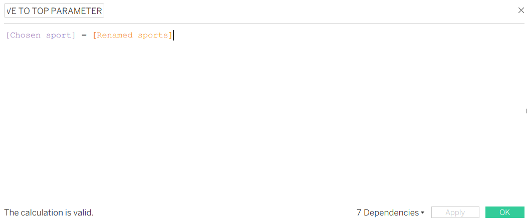 Step 3: Create your move to top measure. Simply copy out the calculation below in the format parameter = category. This is dependent on what you have named your field/parameter and what dataset you are using.