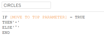 Step 4: Create your circles measure. Copy out the calculation below using your move to top measure (I have called this move to top parameter to note to myself that it's connected with the parameter but might not have been the wisest for a blog! Still, you can tell it's a field as it's orange, not purple like parameters are in calculated fields). The hardest part about this calculated field is trying to find a good circle. If you're struggling, you can always use triangles or another shape. Just as long as it makes it clear which category has been selected (and Tableau can read it), you can use whatever you like.