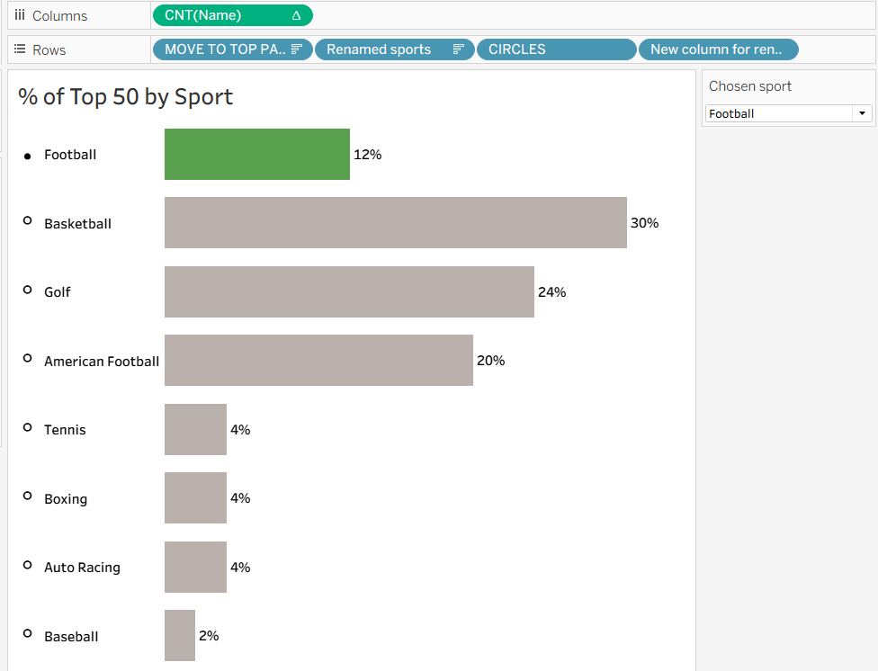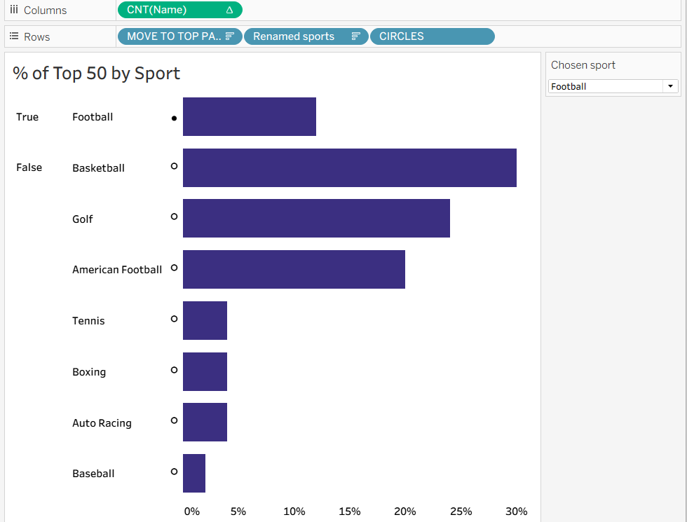 When you add this to your rows shelf, you will come across the issue that your circles will only show for the top true/false value unless you put it at the end of the shelf. But then it doesn't look as effective as it does on the left of your categories, like in the feature image. You'll need to create a new field to fix that.